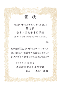2025年10月25日(土)にオンラインで開催されたKOSENセキュリティコンテスト2025(主催:木更津高専)において、本校から参加したチームが見事優勝いたしました。